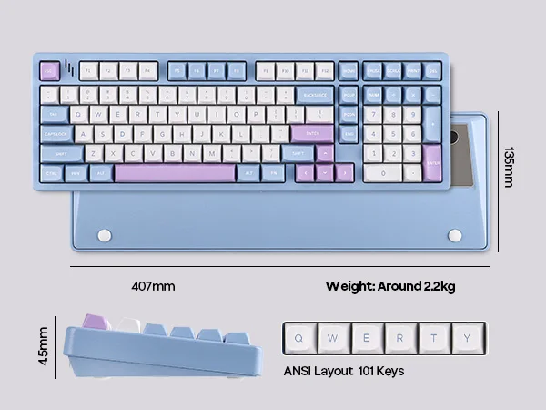 The MechLands Blade101 features a space-saving 1800 layout with 101 keys, giving you full numpad functionality in a more compact footprint. Its all-aluminum case with a smooth spray-painted finish delivers excellent durability, added weight for desk stability, and a clean, refined aesthetic. Dual kickstands on the bottom allow for comfortable typing angles during long sessions.