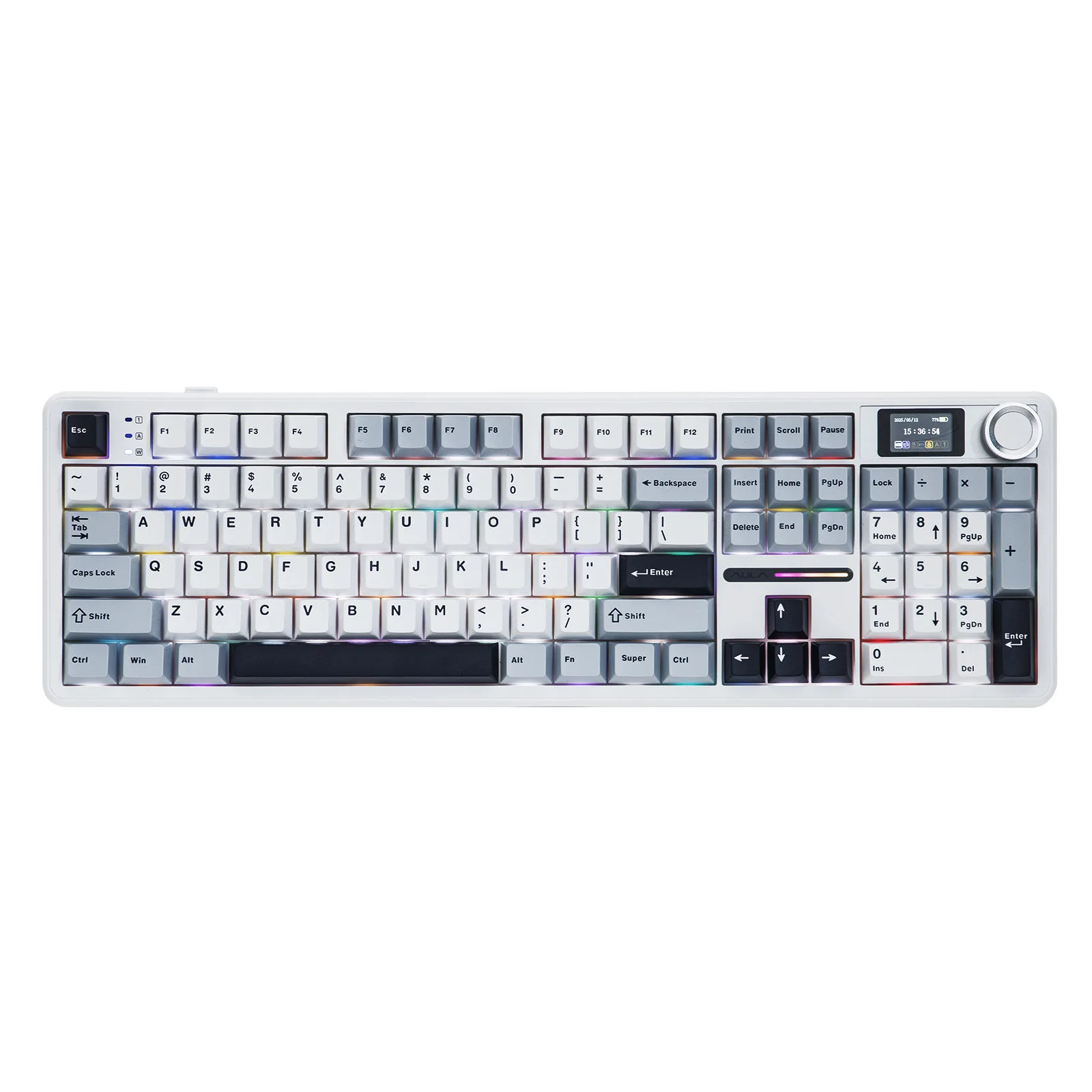 Dedicated numpad, navigation cluster, arrow keys, and function row