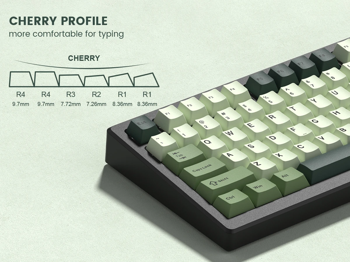 The Cherry profile offers a more natural, comfortable typing angle with a slightly sculpted shape that many typists and enthusiasts prefer.